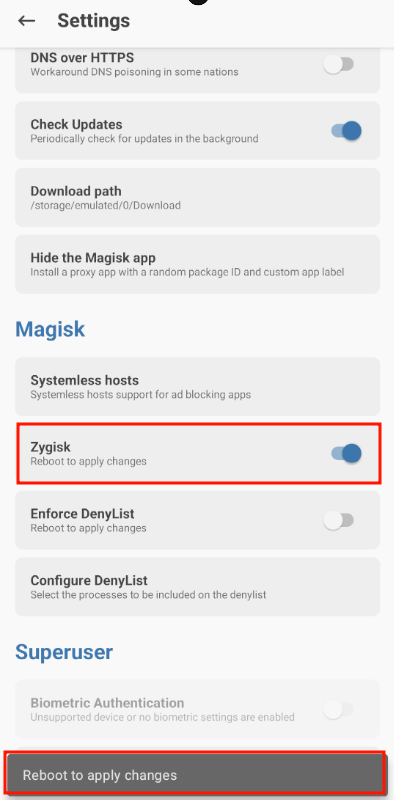 Scroll down and check the "Zygisk" box. A reboot will be performed to apply the changes:
