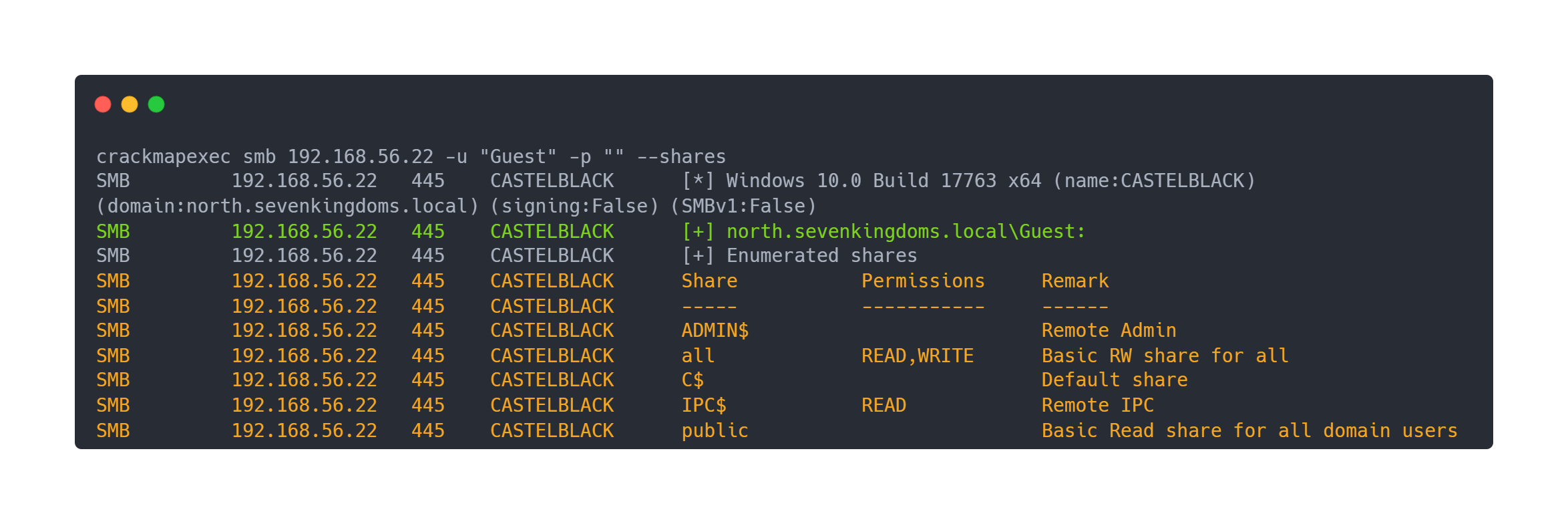 SMB 192.168.56.22 445 CASTELBLACK [*] Windows 10.0 Build 17763 x64 (name:CASTELBLACK) (domain:north.sevenkingdoms.local) (signing:False) (SMBv1:False)